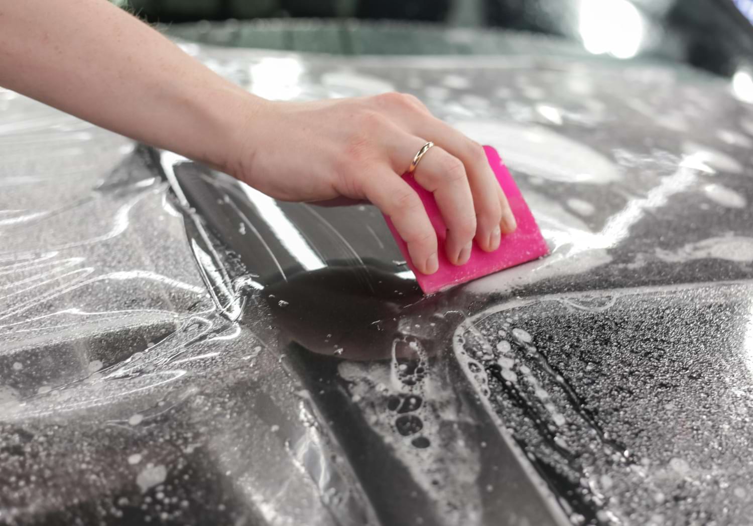 Kolejnym etapem aplikacji jest przygotowanie folii PPF do nałożenia na samochód. Profesjonaliści korzystają z dwóch głównych metod: stosowania gotowych szablonów CAD, które są precyzyjnie dopasowane do każdego modelu pojazdu, lub cięcia folii bezpośrednio na samochodzie. Obie metody mają na celu idealne dopasowanie materiału do kształtu karoserii, unikając nadmiernego naciągania folii i zapewniając estetyczny efekt końcowy. Podczas nakładania folii używa się specjalnego płynu poślizgowego o kontrolowanej lepkości, który umożliwia łatwe przesuwanie folii po lakierze i minimalizuje ryzyko powstawania pęcherzyków powietrza. Płyn poślizgowy ułatwia również precyzyjne ustawienie folii na każdym elemencie pojazdu, od dużych paneli drzwi i maski po bardziej skomplikowane krawędzie i zakamarki.